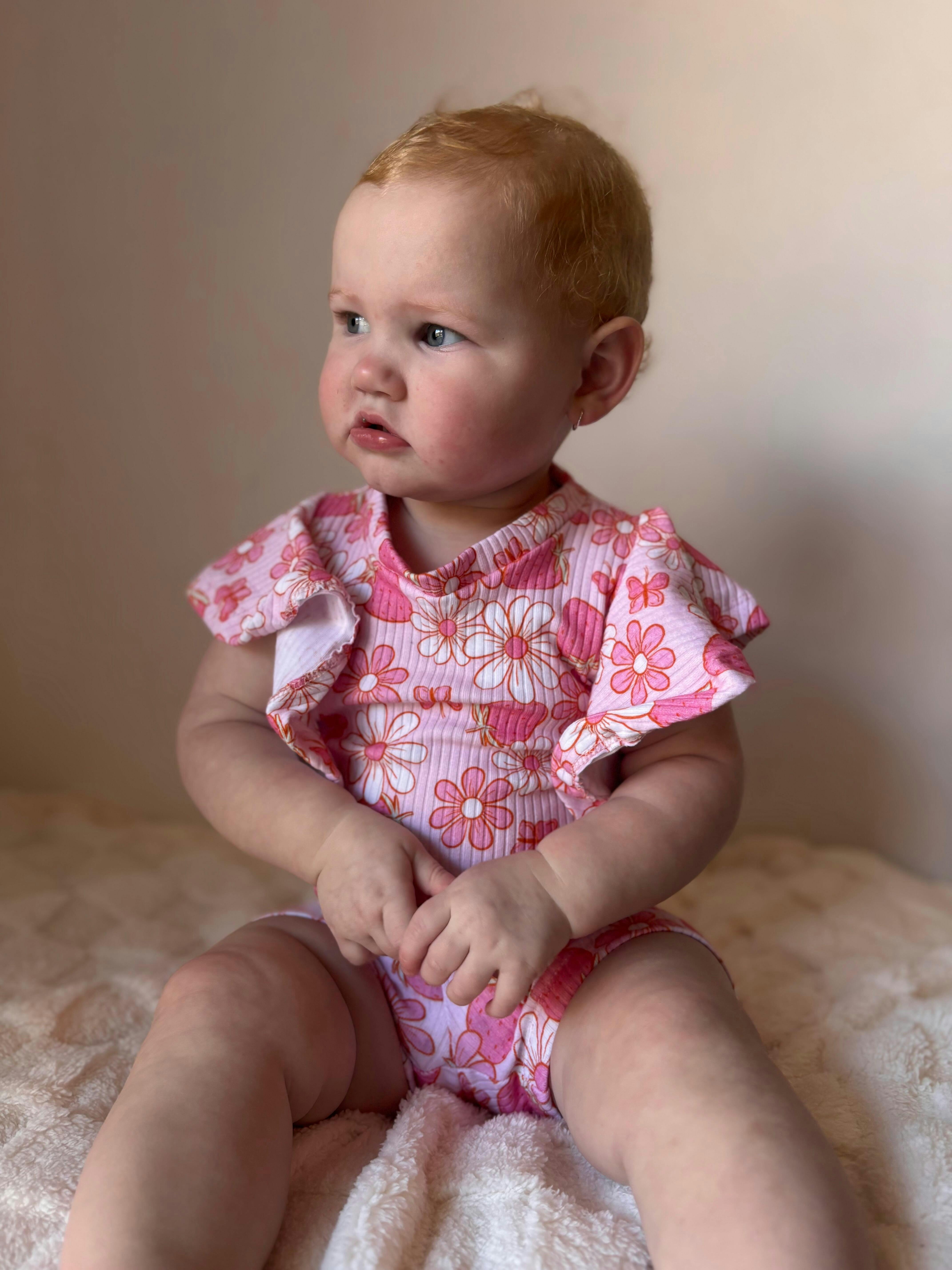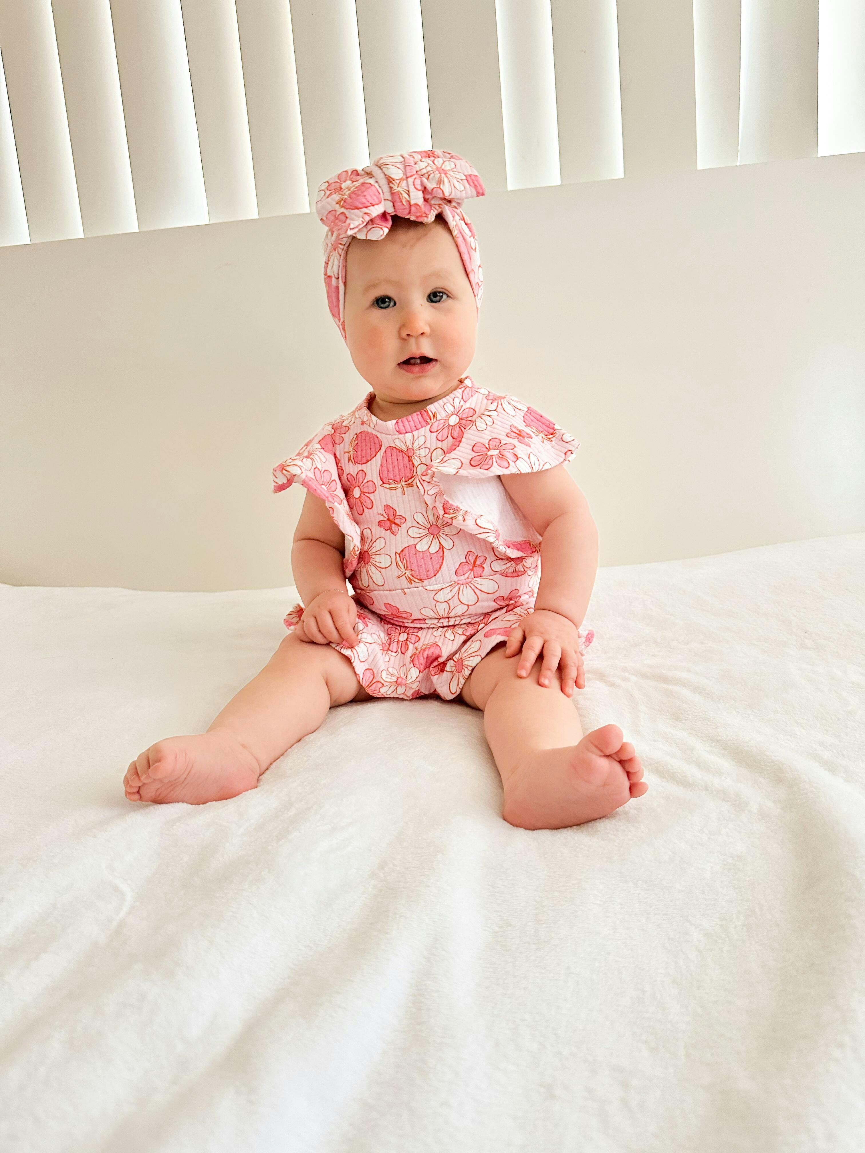 Our berry bloom bodysuit has the sweetest frilly sleeves and has snaps at the crotch for easy nappy changes - up to size 2. Matching bow is available to complete the look.