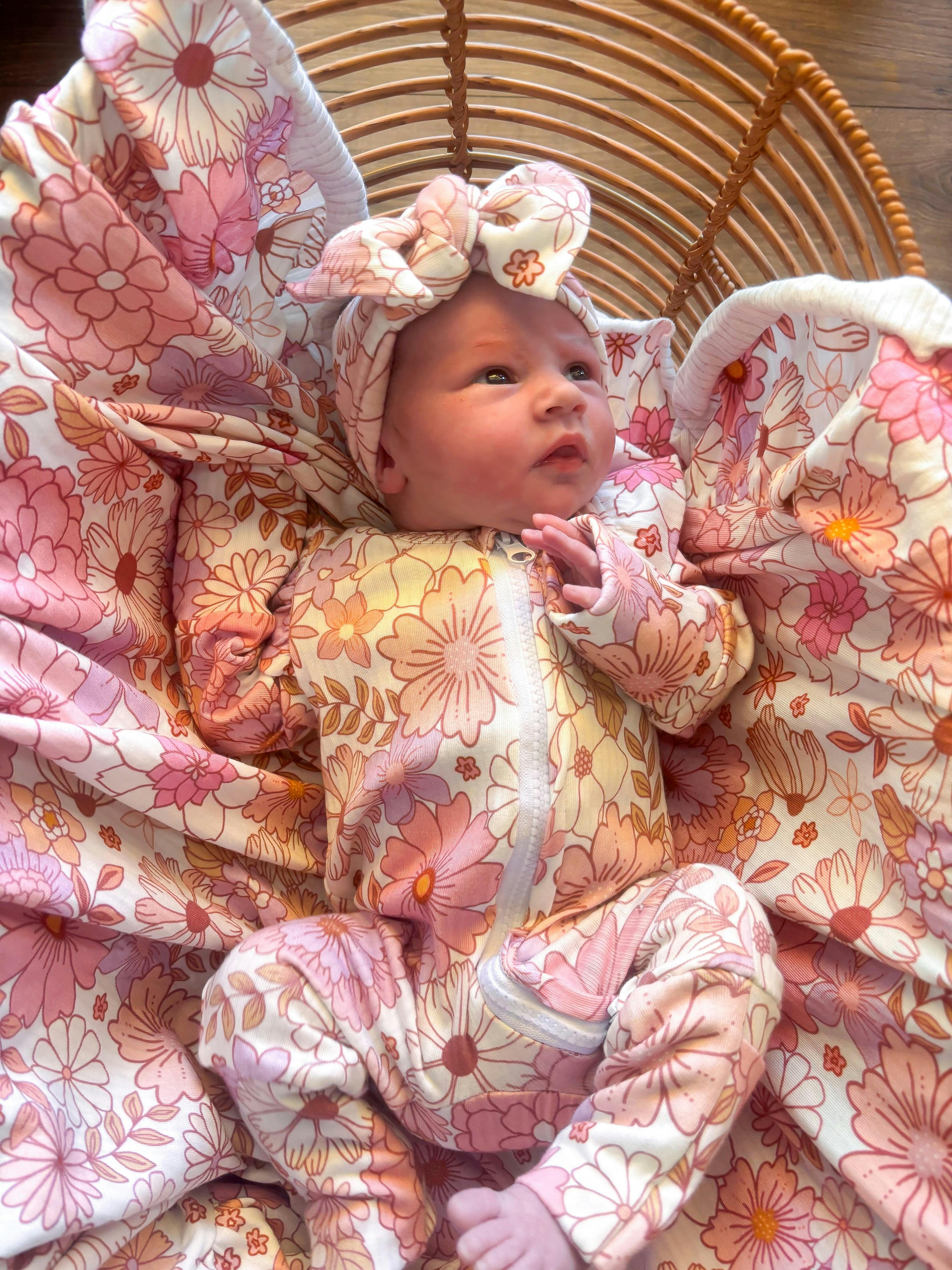 I absolutely adored this print so much that I bought the romper in my daughter's current size and the next size up. We also got the bow and the blanket. The set is absolutely beautiful. The material is so soft and is stretchy so it will fit for a very good amount of time. Highly recommend.
