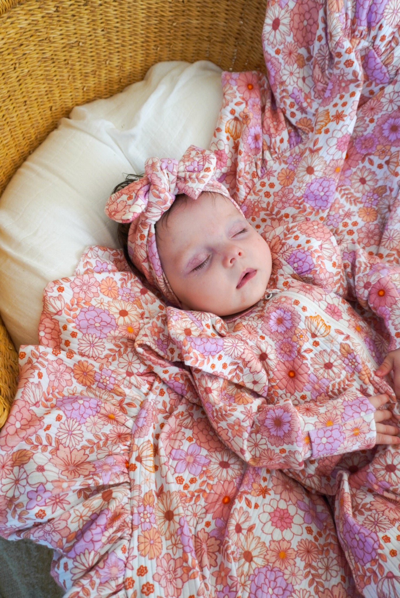 Designed with a two way zip for easy nappy changes, foldable mittens and feet covers. Matching bow, mini bow and blanket are available to complete the look.