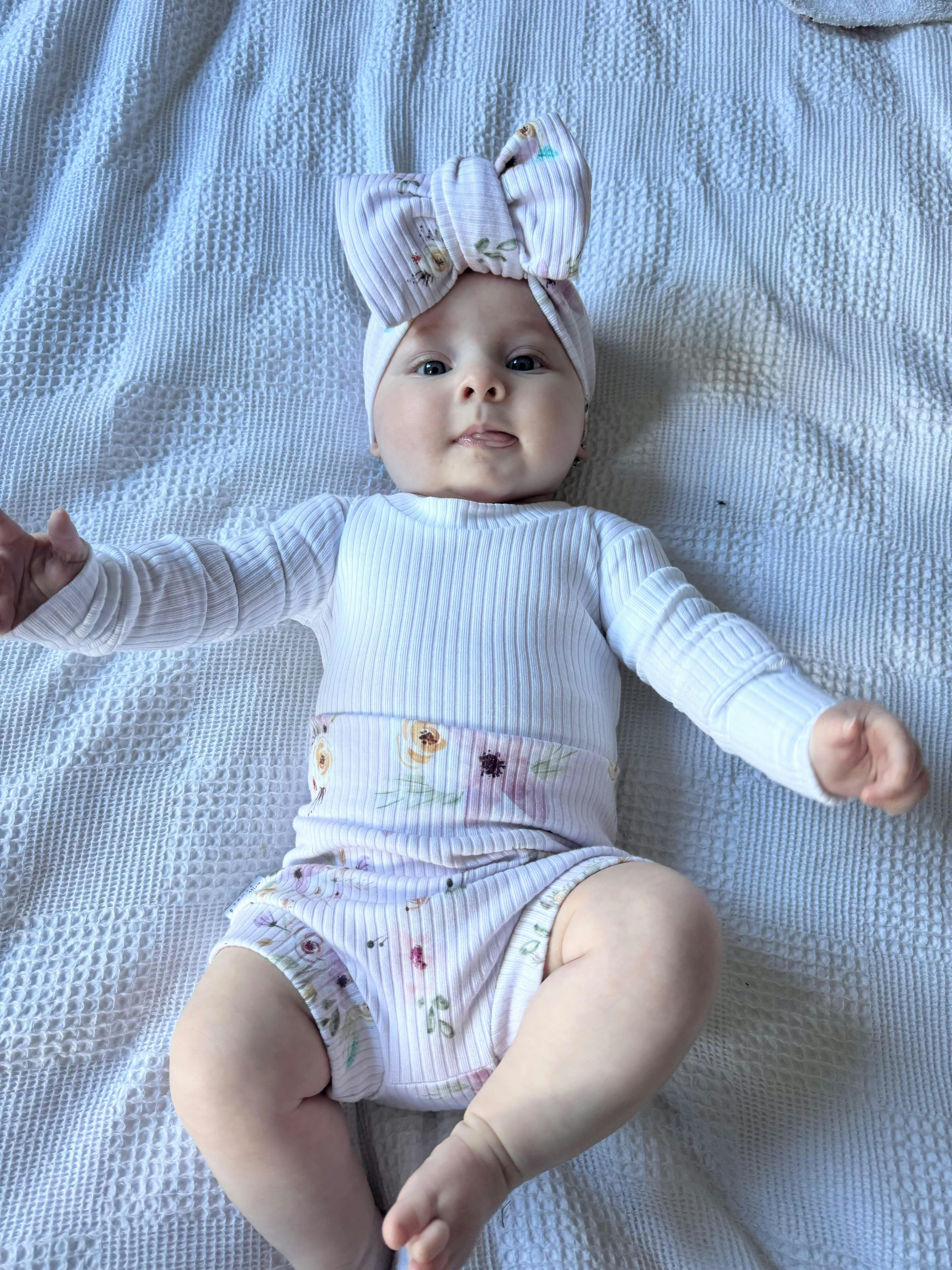 Our adorable ribbed bows are soft and stretchy, making them easy for your little darling to happily wear. A very pale pink with delicate florals.