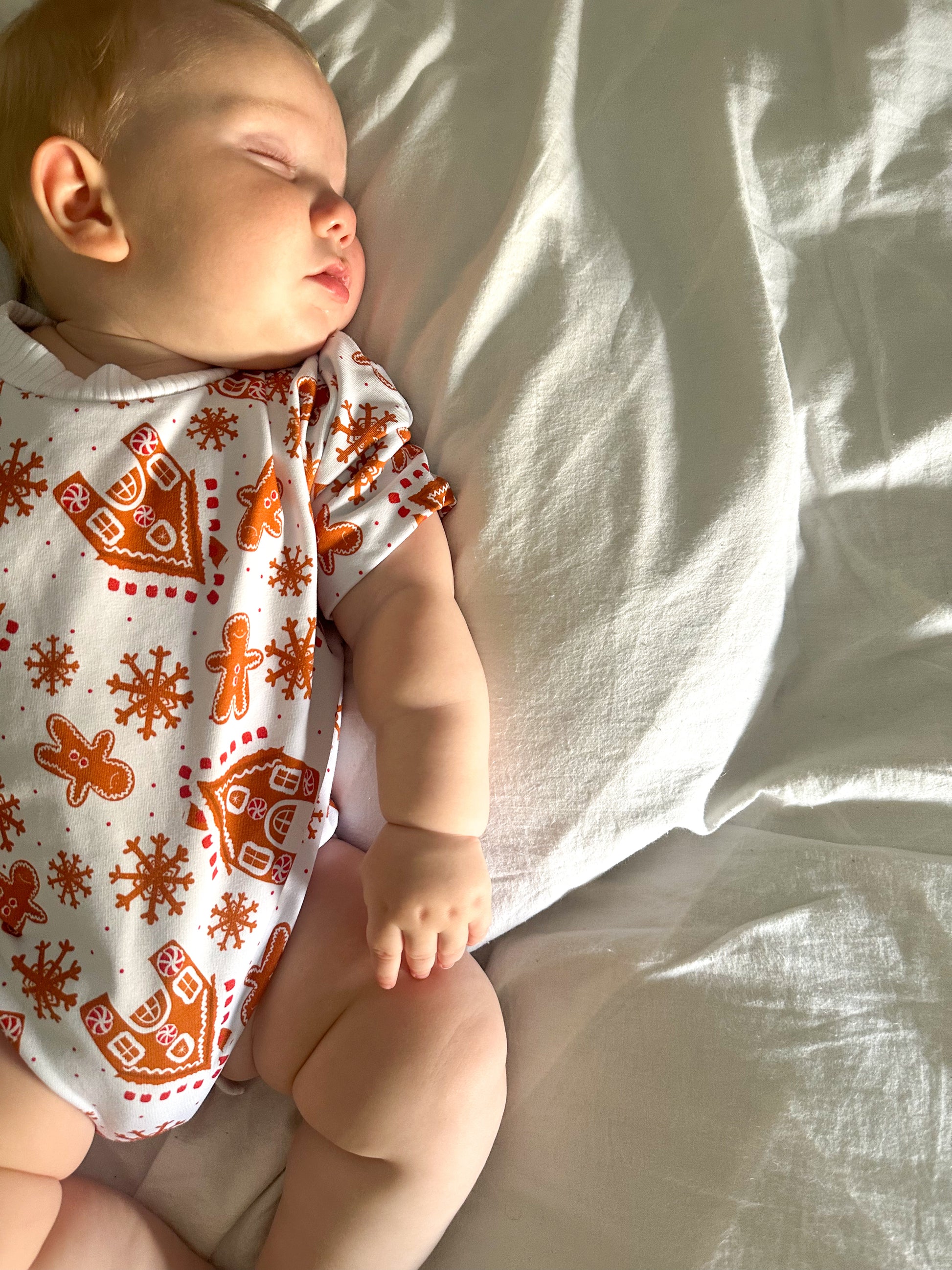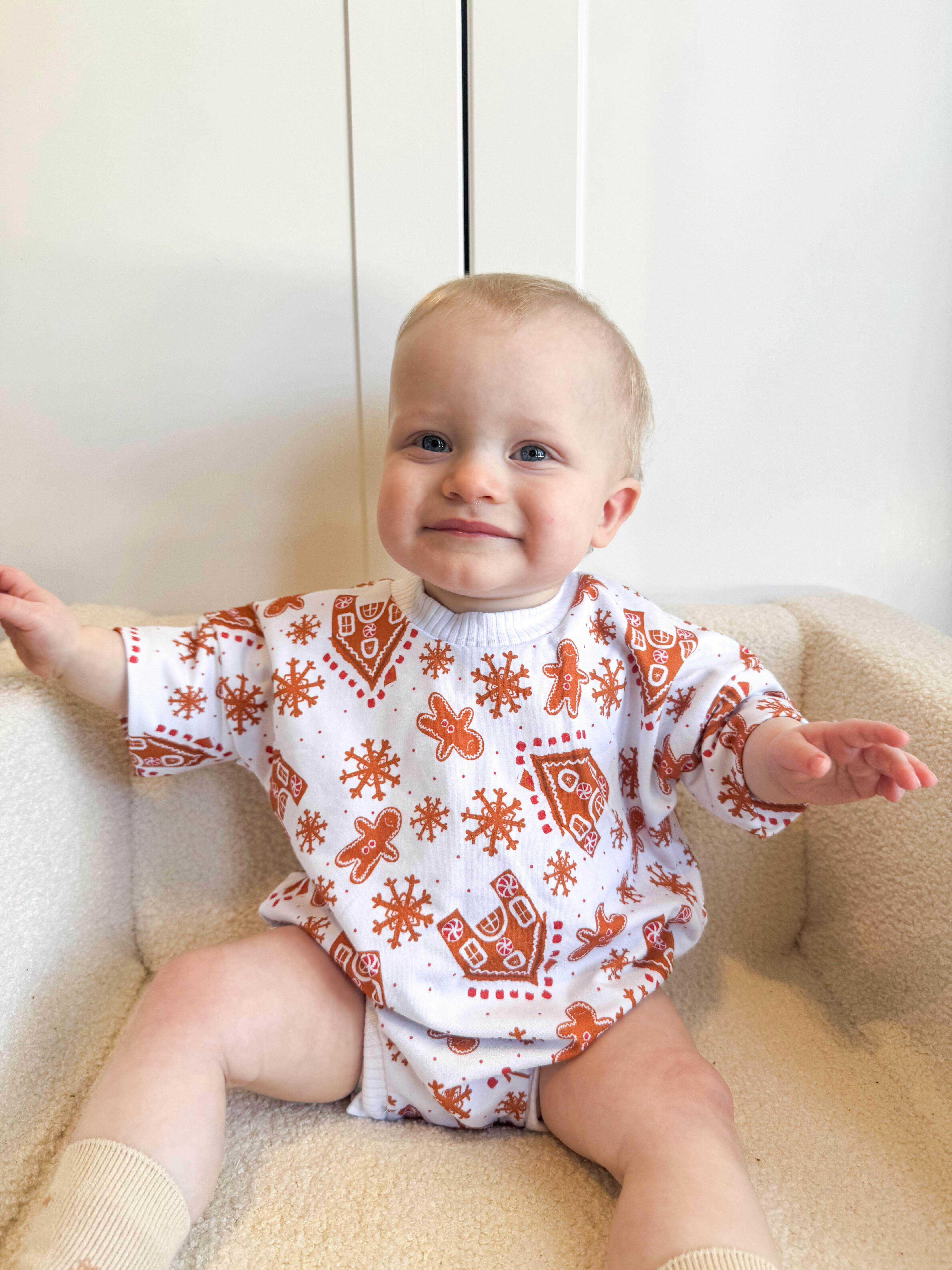 The perfect neutral romper for your little darlings Christmas outfit! Featuring a super cute print of snowflakes, gingerbread man and gingerbread house.