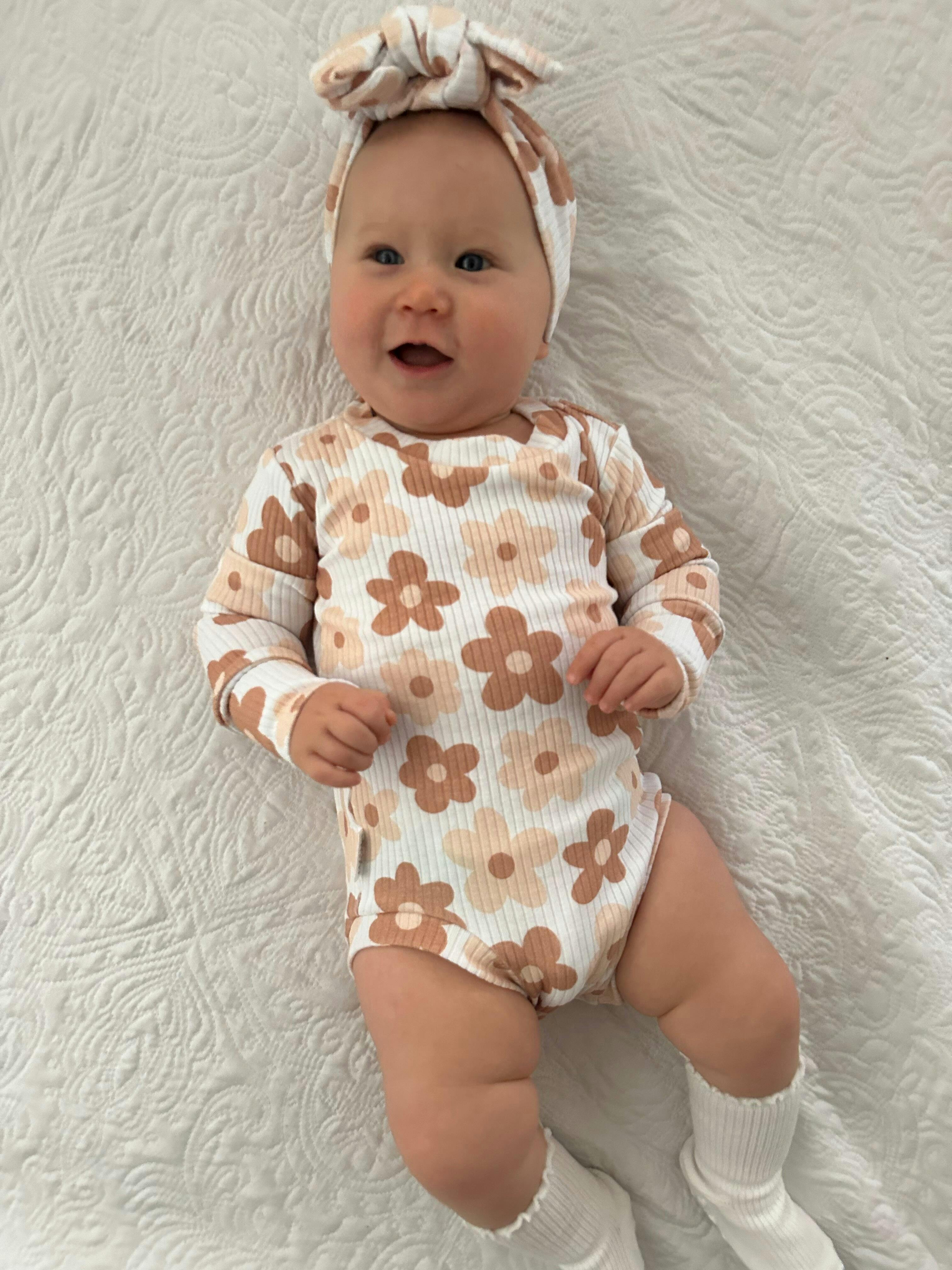 Our Luna bodysuit has snaps at the crotch for easy nappy changes. Matching leggings and bow are available to complete the look.