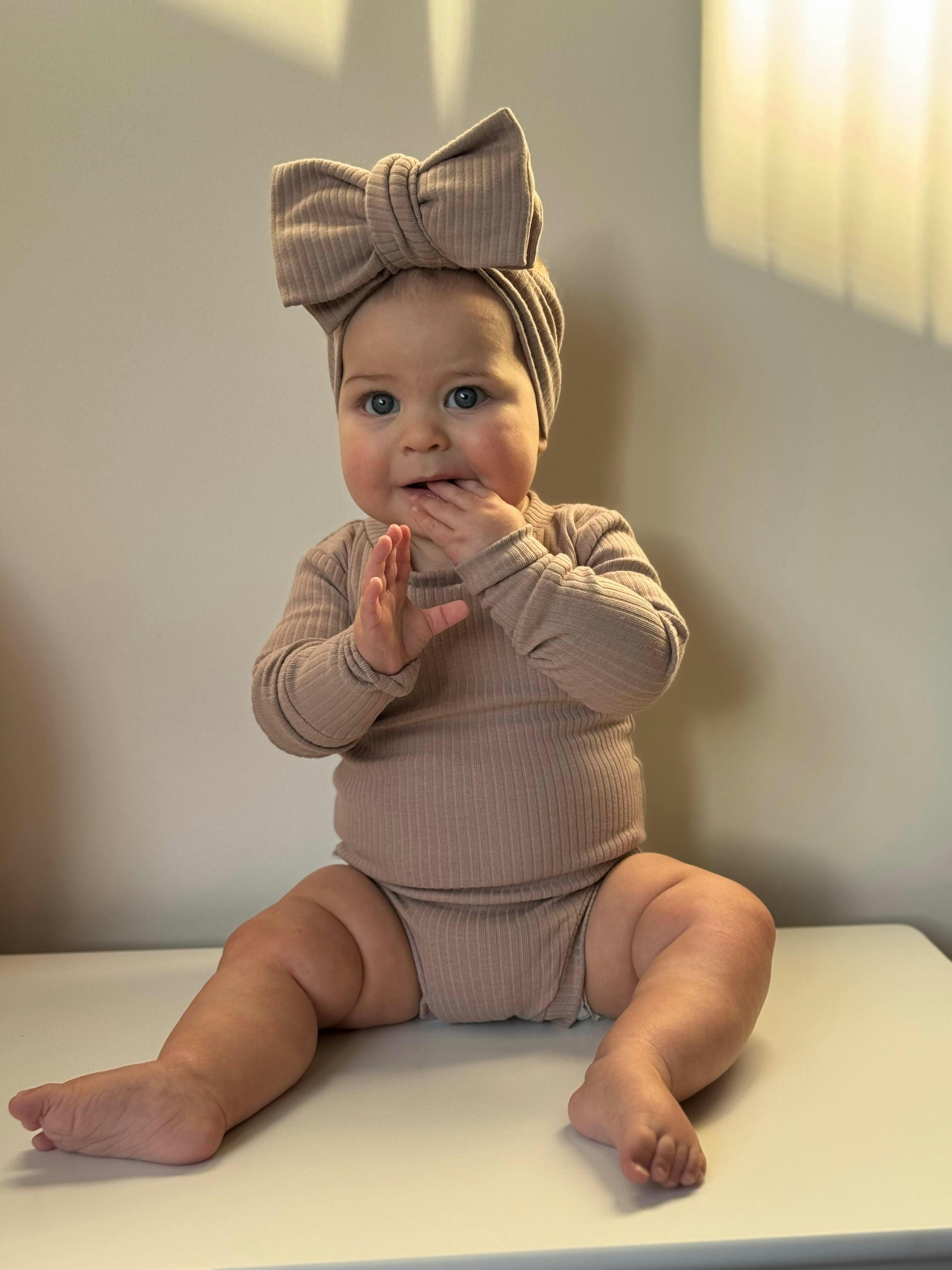 Our Nude bodysuit has snaps at the crotch for easy nappy changes. Matching leggings and bow are available to complete the look.