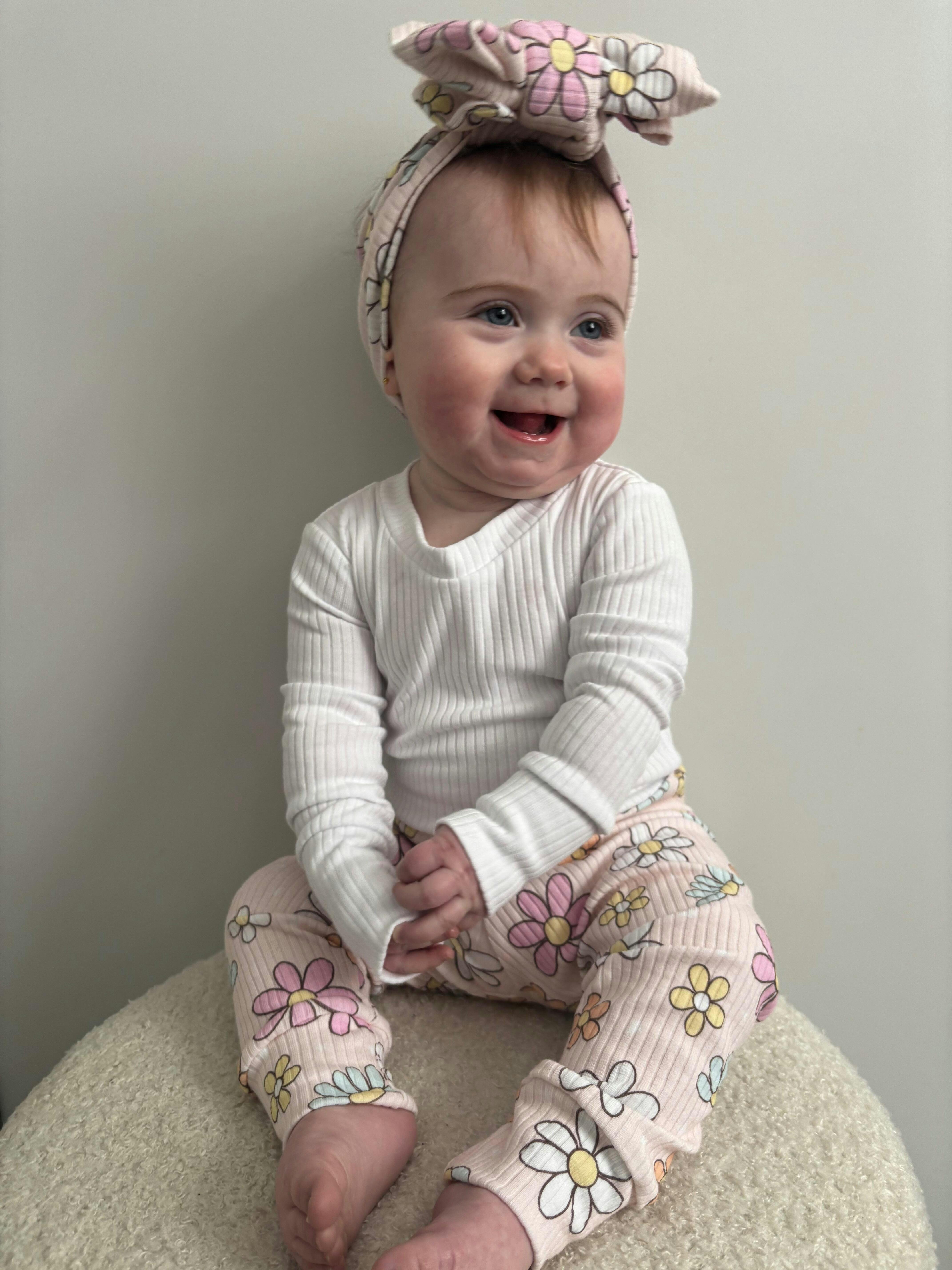 Keep your little darlings warm with our beautiful, handmade ribbed leggings. Posy is a very pale pink colour with cute daisies.