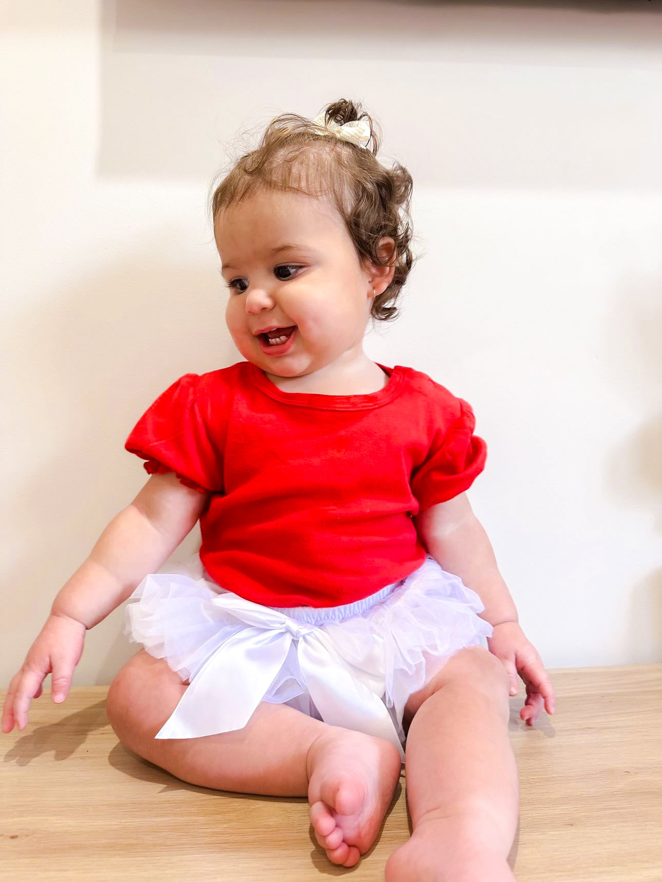 Our red bodysuit has snaps at the crotch for easy nappy changes + snaps at the neckline. This bodysuit is slightly on the larger side lengthwise, so if your little darling is in-between sizes, you could size down for a more fitted look.
