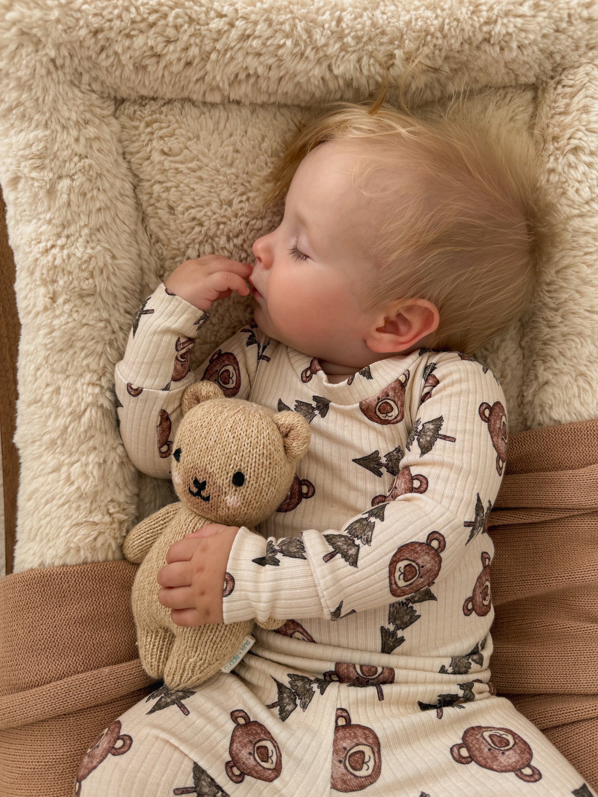 Made from a beautiful ribbed knit fabric, featuring cute little teddy bears and trees on a beige coloured base. It’s giving cute teddy bear hunt vibes!